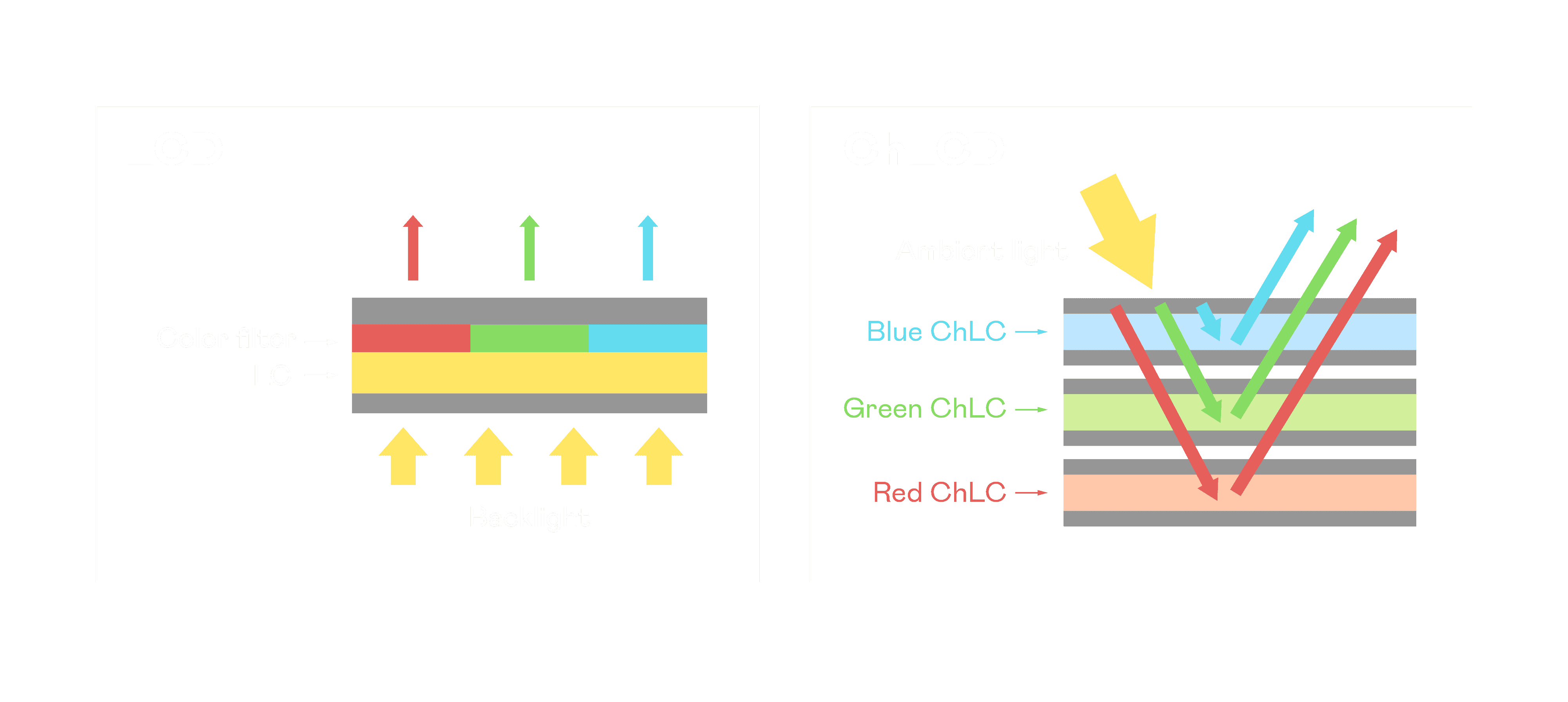 ChLCD 胆固醇液晶就如同纸张一样,,透过反射环境光来显示影像,,,,因此长时间观看不易造成人眼视觉疲劳,,可达到护眼效果。。当处于户外阳光下使用,,,,LCD 影像容易失真而不易观看,,,但胆固醇液晶仍可维持较佳的影像品质。。。