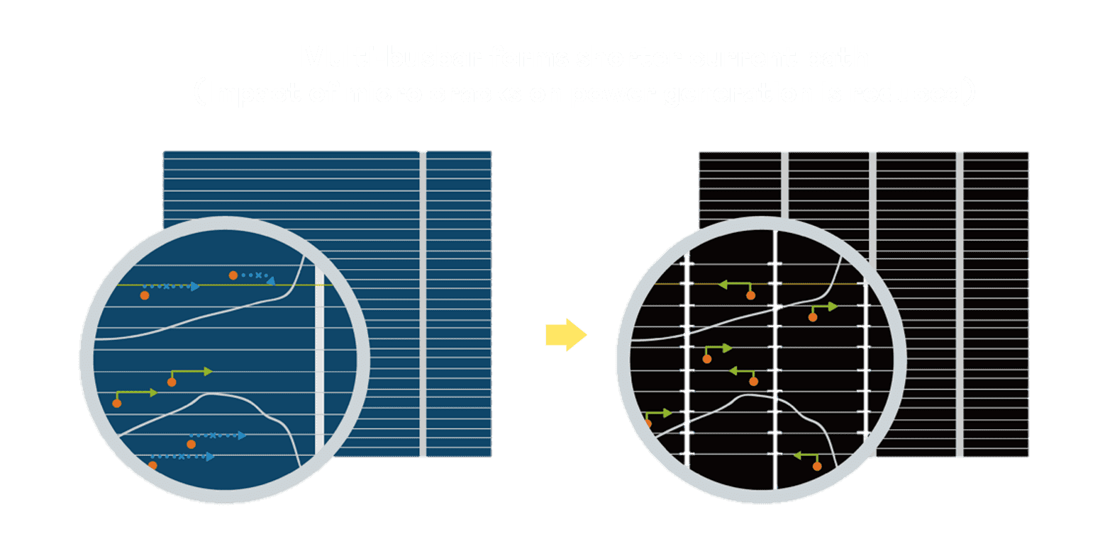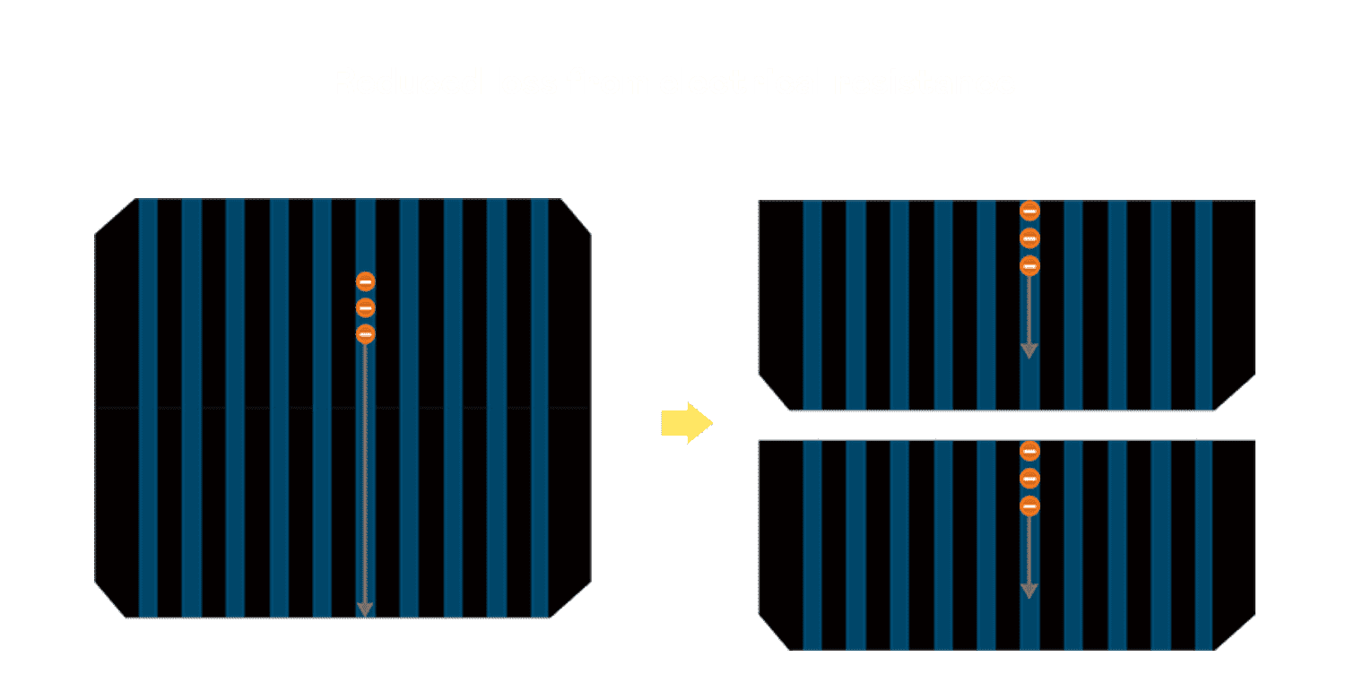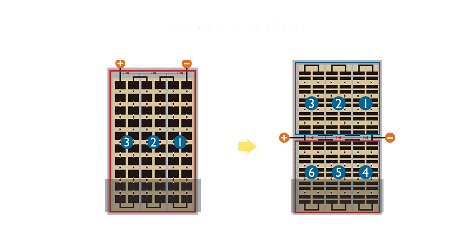 - 结合半切电池,,,降低遮阴影响、、、、提升模组抗隐裂能力、、、并减少电阻损耗,,,进一步提升模组发电效能。。