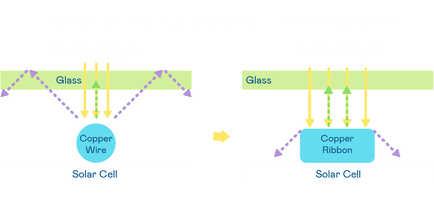 - 电池使用多条铜导线 (Copper wire) 于电池片上形成较短的电流路径,,提高电流收集效率,,,,采用圆形设计的铜导线较传统扁平式的铜焊带 (Ribbon),,,,可增加入射至电池的光线量。。